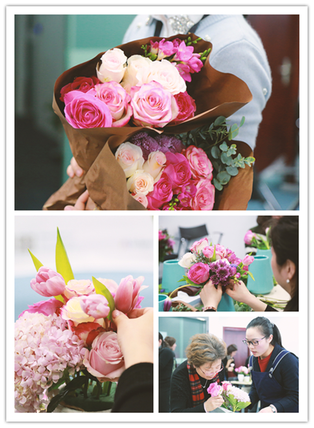 本次沙龙邀请了知名花艺店的四位老师,讲授插花手法、花色和品种搭配技巧。在花材方面,花艺老师精心挑选了厄尔多瓜玫瑰、绣球、郁金香、薰衣草等深受女性喜爱的鲜花品种,插法则采用了日常生活中最实用的瓶式花艺。花艺老师现场带领大家修剪花瓣、花枝、教授插花手法,纠正了插花中常见的错误,并贴心对日常花材的养护进行了详细的说明。