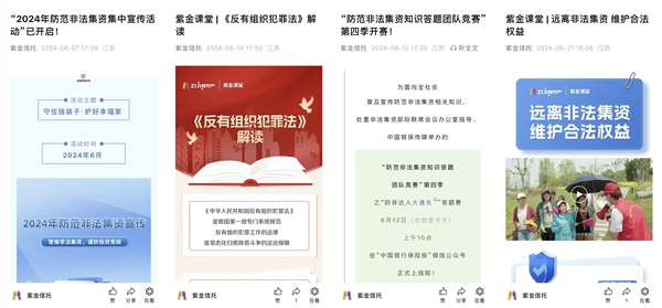 6月是全国防范非法集资集中宣传月,为深入贯彻金融消费者权益保护理念,不断提升社会公众风险防范意识和能力,紫金信托积极组织开展了一系列防范非法集资宣传活动。